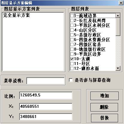 增加或删除新的地图显示方案 ,该显示方案可以实现设置GIS图形比例、中心点坐标、图层的显示、操作组合等功能。