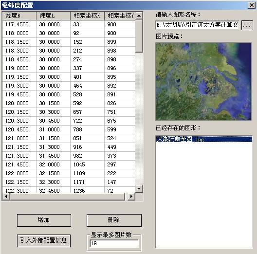 增加——将选择好的卫片存放路径并引入其经纬度坐标和相素坐标后的图片作为底图。增加后卫片的名称列表放在已经存在的图形列表框中。