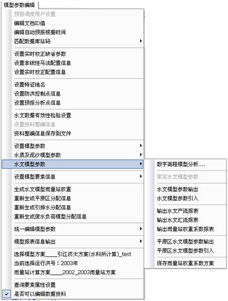 模型参数编辑菜单下的水文模型参数子项包含数字高程模型分析,率定水文模型参数,水文模型参数输出,输出水文产流报表,输出水文产流报表输出水文汇流报表输出雨量站权重系数报表等功能。其中可以通过数字高程模型分析选项由DEM生成流域水系。