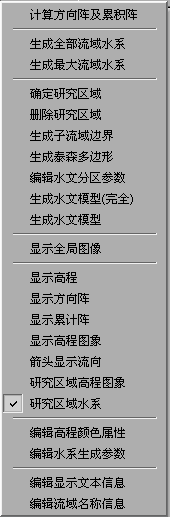 设为泰森多边形区域——选中干流或某支流,此菜单项即可用。选择此菜单项后,在执行“DEM高程生成”的“生成泰森多边形”,即可生成整个区域或某个子区域的泰森多边形。