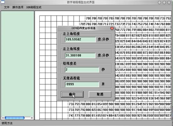 2)引入DEM数据:打开“文件”菜单中“引入DEM数据(单文件)”,选中沿渡河DEM数据.txt,得数据高程的网格,在跳出的“DEM经纬度坐标信息”中点确定按钮。