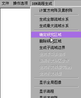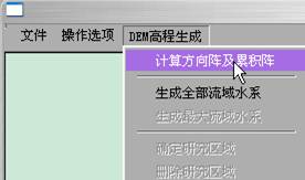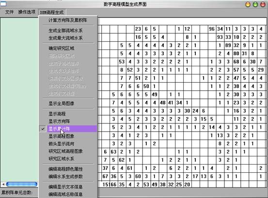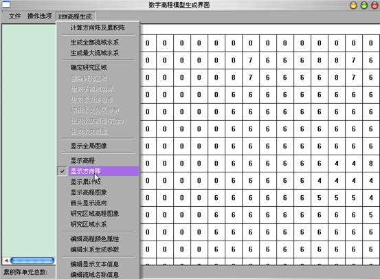 4)计算方向阵及累积阵:点击“DEM高程生成”菜单中的“计算方向阵及累积阵”,之后在“DEM高程生成”菜单中选择“显示方向阵”、“显示累积阵”可在屏幕上显示方向阵、累积阵。