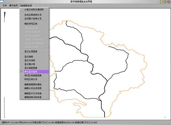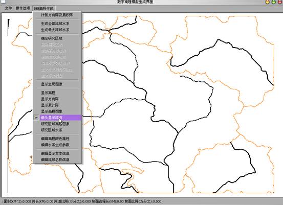5)生成流域水系:执行“DEM高程生成”菜单中“生成全部流域水系”后选“箭头显示流向”,适当缩小图形后可得全流域水系图;“生成最大流域水系”后选“箭头显示流向”,适当缩小图形后可得流域最大水系图。