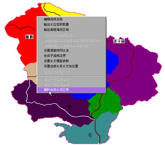 如果要与B流向的子流域C合并,选择右键菜单中“与下一子区域合并”,但是子流域B若为最高级子流域,选择右键菜单中“删除当前流域水系”;