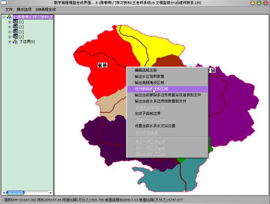 8)子流域的合并:打开“操作选项”菜单中“研究区域选择与操作”选中所要进行合并操作的子流域B,右键点击:
