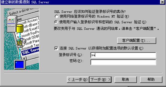 在上述界面中《登录标识号》与《密码》是用户在网络数据库中的注册用户名与密码,需要填写正确。图中的SA为数据库系统管理员标识号。在所有这些均填写正确后,单击《下一步》按钮出现下图所示的对话框界面。