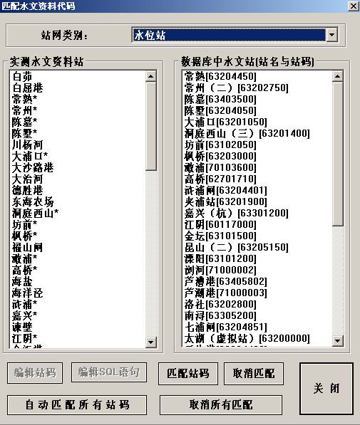 在完成了前面两步之后,此时在左边的实测水文资料站列表框和右边的数据库中的水文站列表框中应该已经有了相应的测站。如两两对应的测站有着相同的名称,用户只需点击自动匹配所有测站,来建立二者的映射关系。如名称不同,用户需手动点击匹配站码。