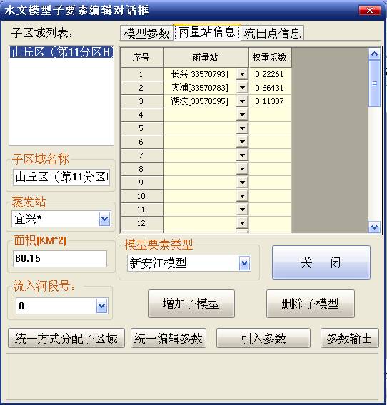 在编辑子模型要素的界面中的雨量站信息中,手动选择所用站点及其权重系数,保存。