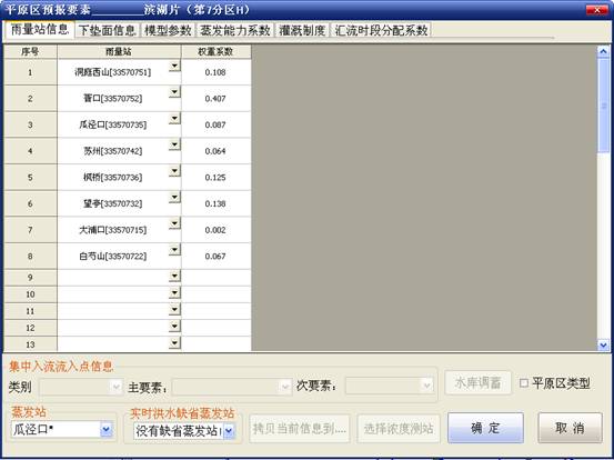 在平原区预报要素中,在其雨量站信息中手动选择所用站点及其权重系数。