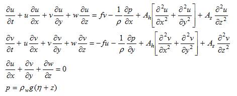其中:u、v、w分别为x、y、z轴方向上的流速分量;η为垂直方向上湖面相对与平均水面的高度;ρW为水体密度;AZ、Ah分别为垂直和水平涡动粘滞系数;f为柯氏参数,f=7.23×10-5;g为重力加速度;p为水的压强。