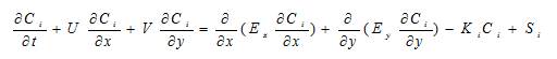 水质方程是以质量平衡方程为基础的,由于三维水质输移方程包涵很多不可确定的参数,在现有条件下,模型的验证存在困难,考虑到资料及模型计算工作量等因素,采用二维水质模型,基本方程为: