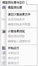 模型预处理,清空计算结果文件,计算结果浏览,模拟滚动预报,编辑输入调度时间,开始运行,中断运行,单步运行,继续运行子项与GIS主界面菜单中的子项功能相同。