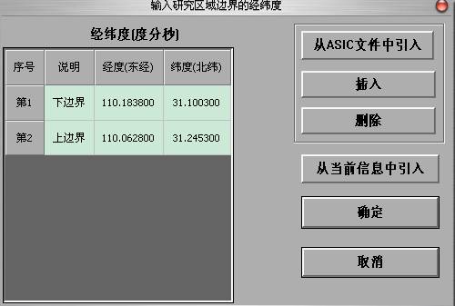 6)确定研究区域:首先打开“操作选项”菜单中“信息查询”,然后左键点击研究区域上下边界点(在干流上),记下屏幕左下角显示的边界点的经纬度坐标(注:沿渡河上边界点经度110度06分28秒、纬度31度24分53秒;下边界点经度110度18分38秒、纬度31度10分03秒);其次打开“DEM高程生成”菜单中的“确定研究区域”,出现“输入研究区域边界的经纬度”界面,输入经、纬度坐标、说明,确定即可得到研究区域内的水系。