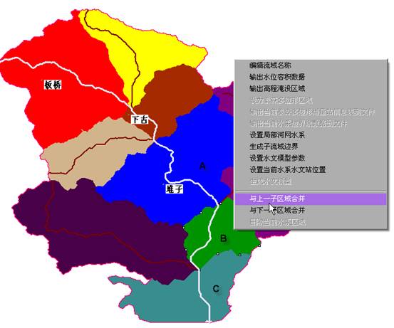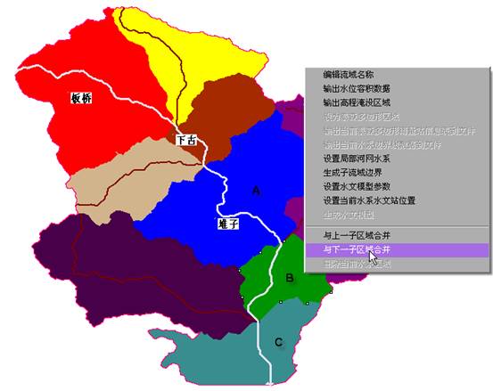 如果要与流入B的子流域A合并,选择右键菜单中“与上一子区域合并”;