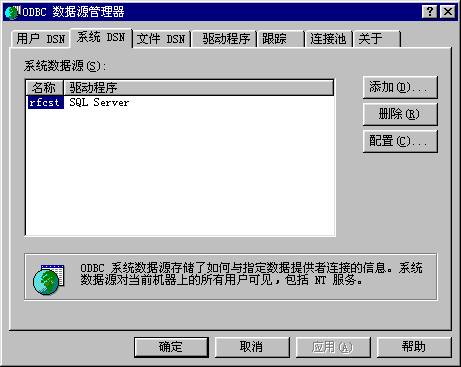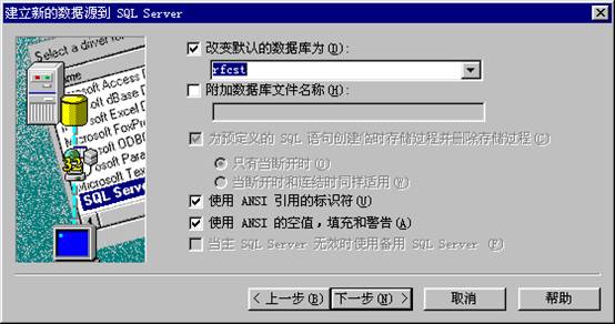 上图中的”RFCST”为用户在网络数据库中创建的数据库名称,该名称一定要输入正确,否则会操作到不是所想要的数据库了,好在名称可在下拉列表框中选取。在该界面的输入正确后其它的一些操作均可按缺省一步一步操作下去,可以完成ODBC数据源的设置。