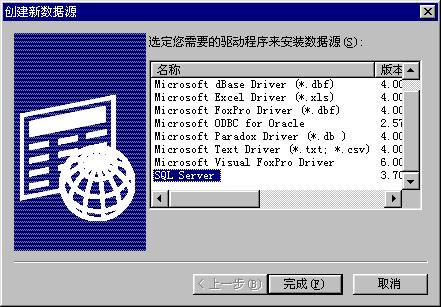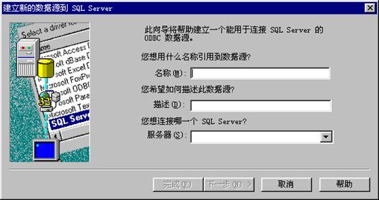在该对话框中选择”SQL Server”的驱动程序(因为本系统的网络数据库安装的是MS SQL Server 6.5/7.0系统),单击《完成》按钮,接着出现下图所示的对话框界面。