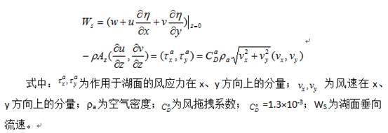 其中:u、v、w分别为x、y、z轴方向上的流速分量;η为垂直方向上湖面相对与平均水面的高度;ρW为水体密度;AZ、Ah分别为垂直和水平涡动粘滞系数;f为柯氏参数,f=7.23×10-5;g为重力加速度;p为水的压强。