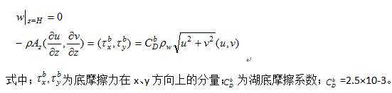 假设湖水为均匀不可压的流体,垂直方向上服从静水压力分布。采用笛卡尔左手直角坐标系,x轴和y轴位于湖水的平均水平面上,x轴向东为正,y轴向北为正,z轴向下为正,得其流体动力学方程为: